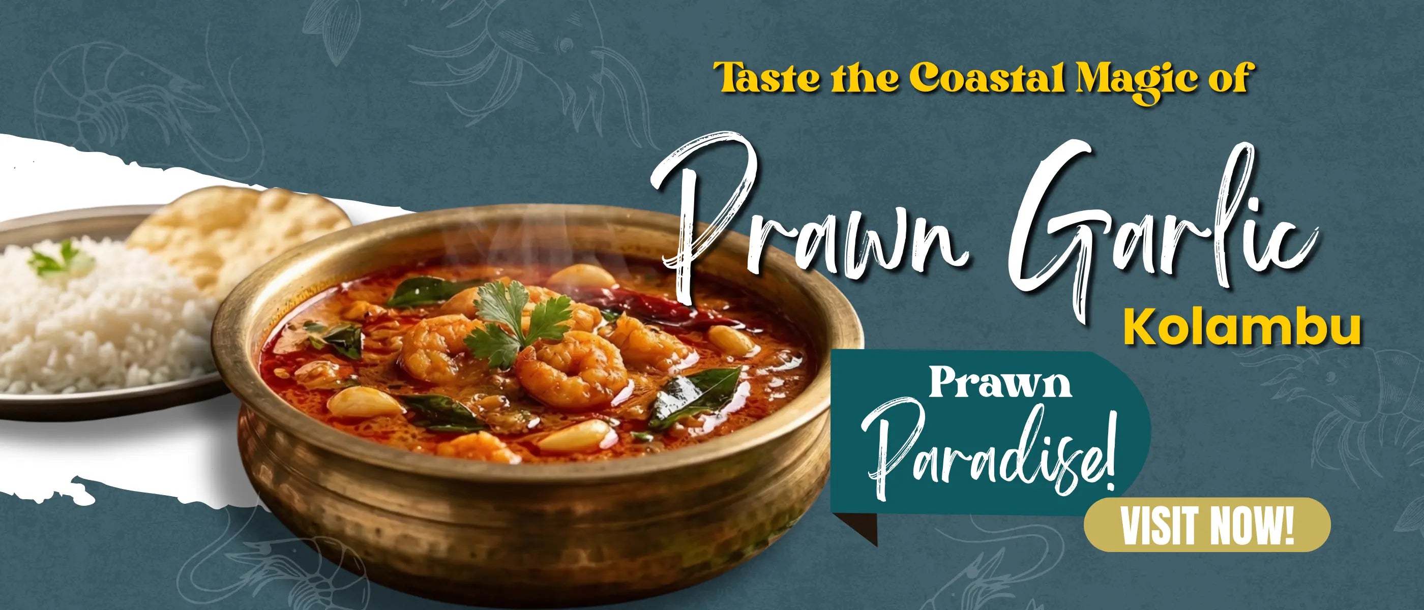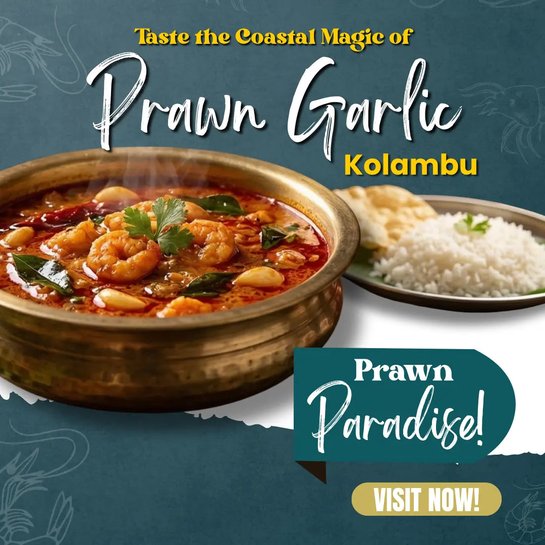 Prawns infused with garlic in a tangy and spicy South Indian curry, a delightful seafood indulgence.